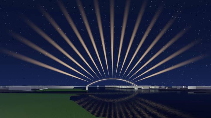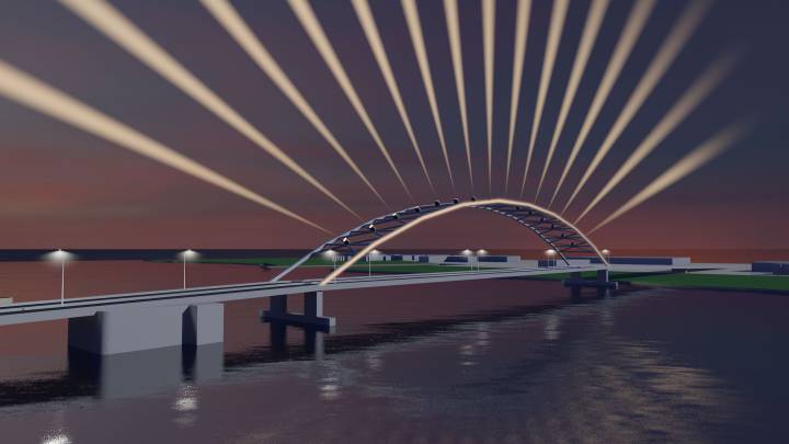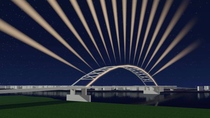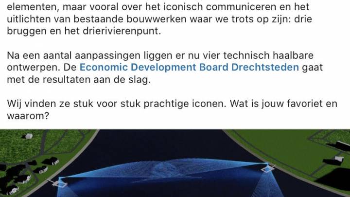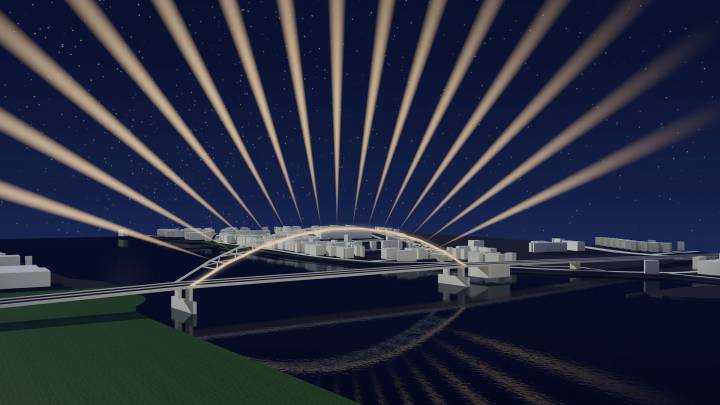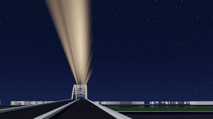 De brug heeft weinig ‘body’, met een fragiele belijning en weinig poespas. Ze past wel bij het imago van het Drechtstedengebied: goed functionerend, maar weinig uitstraling en als zodanig ‘onzichtbaar’. We willen de brug niet verbergen, maar juist haar sierlijke vorm als uitgangspunt nemen om haar om te toveren in een spraakmakend icoon. Daarom stellen we voor de brug zelf licht te laten geven met stralen vanaf haar verlichte boog. Vijftien spots schijnen als een kroon vanaf de bovenzijde van de brug de lucht in. Zo weerspreekt de brug haar eigen onopvallende karakter en verandert in een letterlijk stralend icoon, dat het imago van de regio gaat verlichten…
