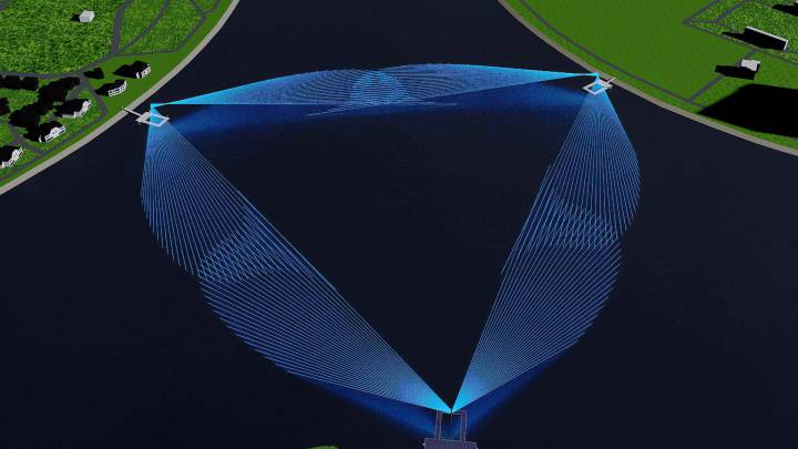 Temidden van die samenstromende rivieren markeren we dit belangrijke middelpunt. Het aanvankelijke plan, een interactieve fontein die vanaf drie kanten altijd het midden zou vinden, kon vanwege de veiligheidsvoorschriften niet uitgewerkt worden. Het alternatief dat nu nader onderzocht wordt is een lichtfontein die vanaf de drie oevers met bijzondere versblijfsplekken hoog boven het water het land en de Drechtsteden verbindt. De weerkaatsing van de stralen in het water leidt tot een verdubbeling van het beeld dat zo adembenemend mooi wordt. De lichtstralen zijn interactief en kunnen reageren op instructies van de toeschouwers, binnen vastgestelde veiligheidsmarges zoals frequentie en kleur.