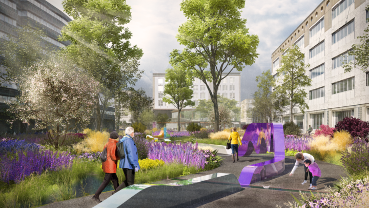 Ook in Almere volgen de ontwikkelingen elkaar snel op. Hier gaat het gebied van station tot aan het Weerwater op de schop, letterlijk en figuurlijk. Een van de vele pleinen die langs de route door het centrum liggen is de Stadhuispromenade. Een lang en leeg plein waar een deel de markt plaatsvindt, omringd door hoge gebouwen, wordt getransformeerd tot een stadspark. Het plein is onderdeel van de Zeegroene Loper, het concept dat Mothership ontwikkeld heeft voor de binnenstad van Almere.