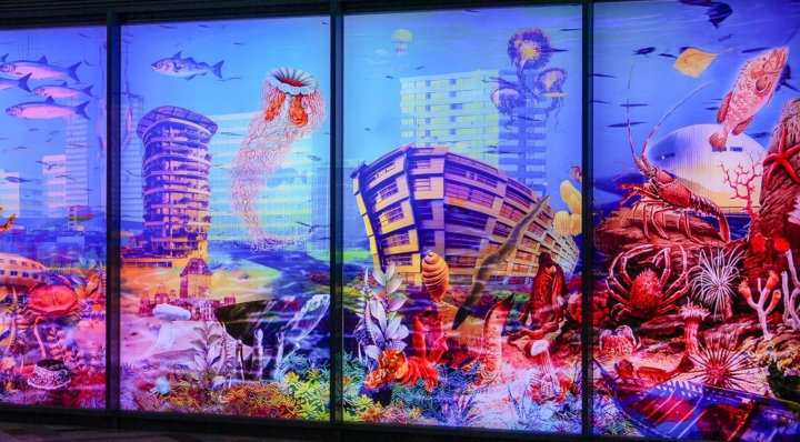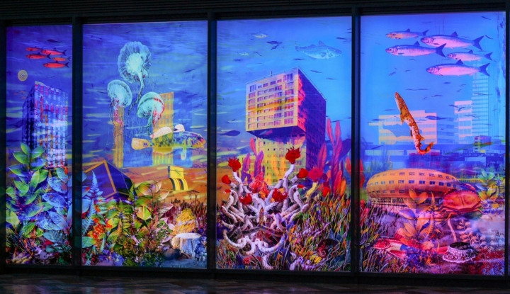 In a dreamy, surreal way, the work portrays that relationship. Is this the sea from which Almere was reclaimed? Or is this a vision of Almere as Atlantis? The image gives space to experience public space in a different way. The station area with Mandelaplein is currently being transformed from a stony, unpleasant public space into a place with quality that offers users a pleasant experience. With gardens and paths and new paving; focused more on the human scale than on traffic flows.