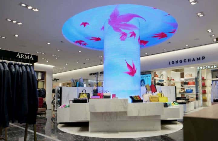 Mothership knew what to do and turned the biggest obstacle in the way into an eye-catcher. The ungainly concrete pillar became the canvas for a work of art. Flexible led panels turn the pillar into a large screen that continues in a circle (diameter 4 metres) on the ceiling.
