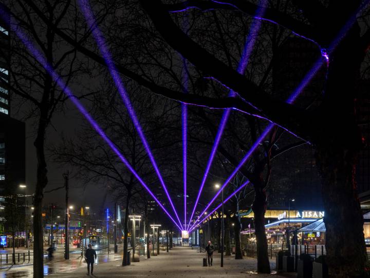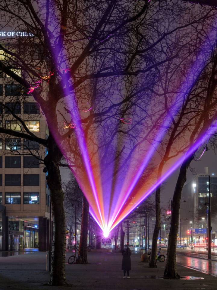 From the two ends of the Coolsingel, laser beams shine horizontally through the tunnels of trees and meet each other halfway. The laser beams move slowly and constantly change colour, creating a beautiful play of lines.