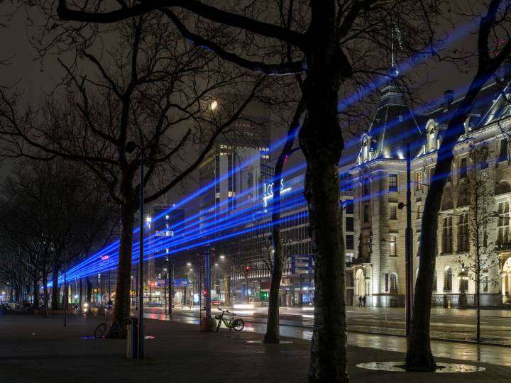 Coolsingel underwent a metamorphosis last year. In order to highlight this metamorphosis in the dark days, it was decided to use laser beams to emphasise the long lines of the Coolsingel, which are particularly prominent in the new design.