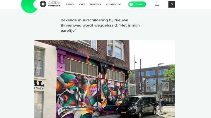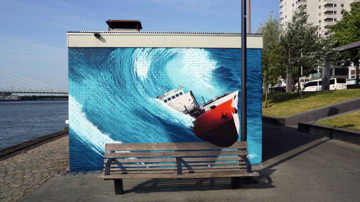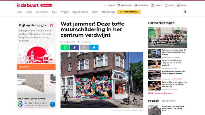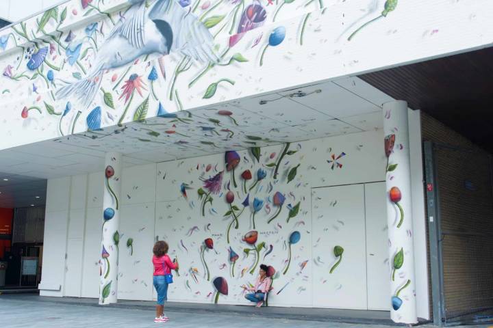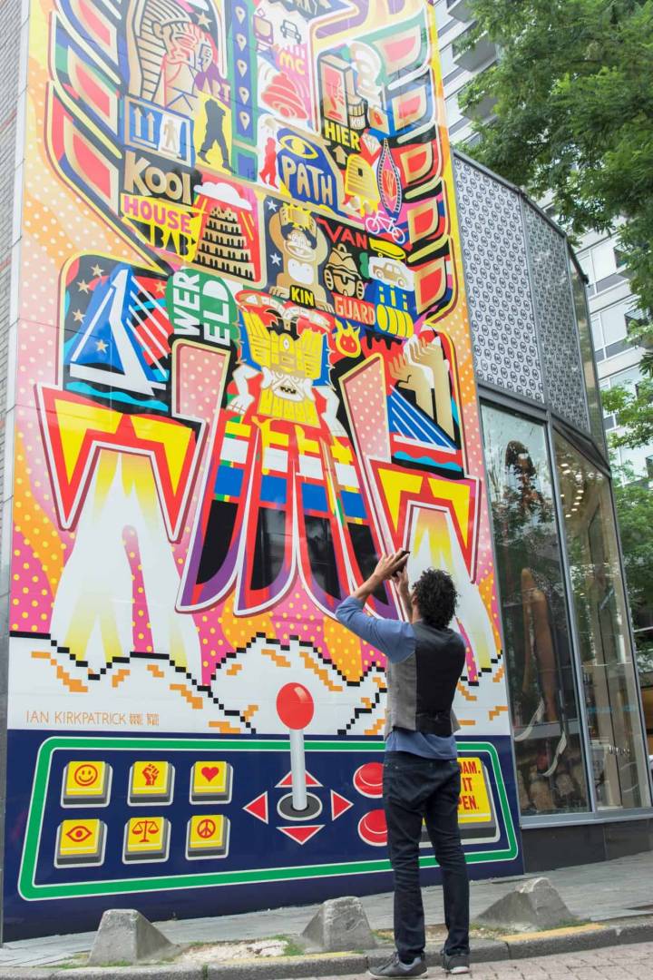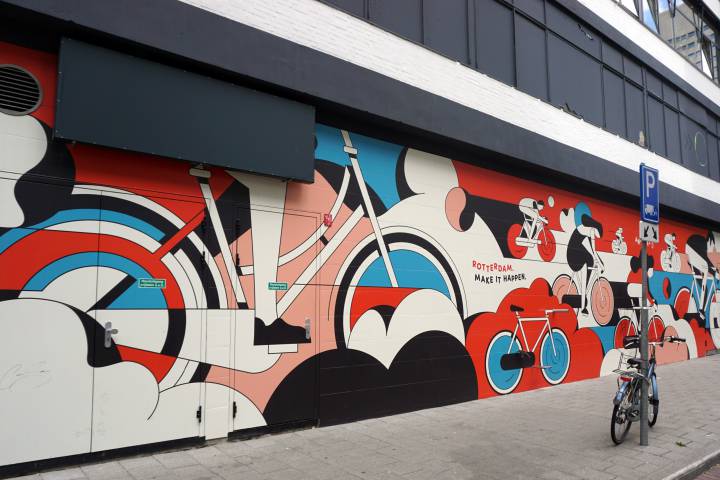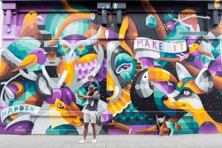 Commissioned by the City of Rotterdam, Mothership has had a lot of interactive Rotterdam Make It Happen artworks made throughout the city. The idea behind this is that Rotterdammers and tourists take pictures with the walls and share them on social media. The work by Eelco van den Berg is called the Urban Jungle. In front of the wall is a small fox, on which you can stand or sit. You also see an owl, a deer, a toucan, a sparrow and a dog. The artist wanted to bring nature back to the city.