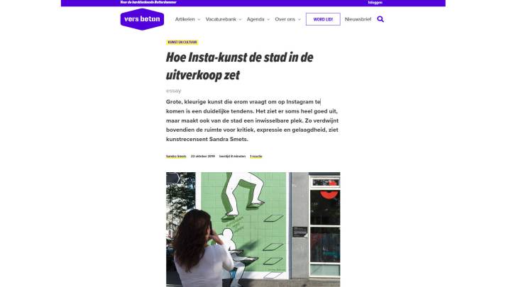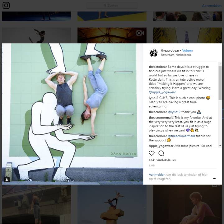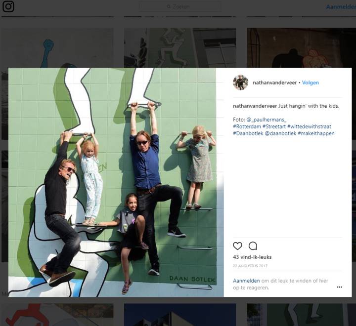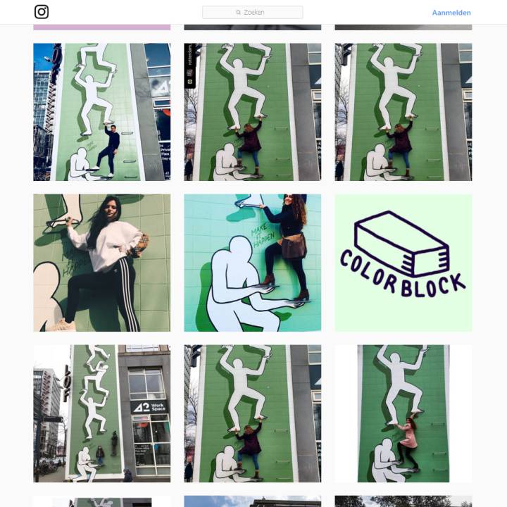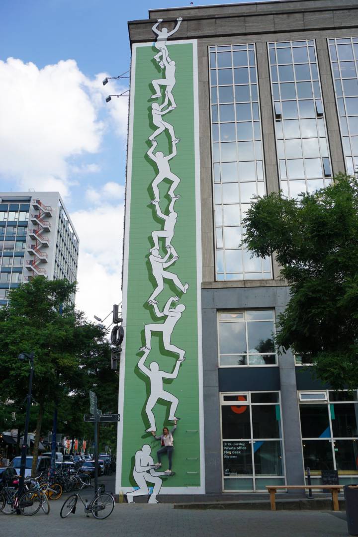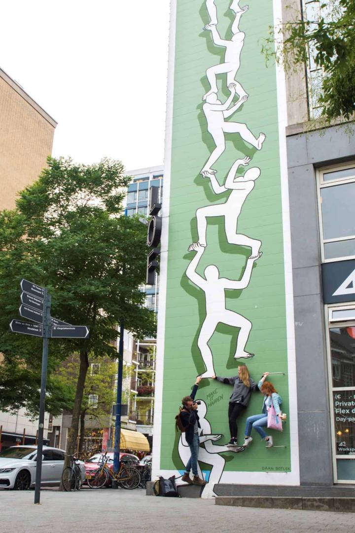 The paintings invite you to participate in the work, which is why three steps have been added. That way you can become one of the climbing figures on the wall yourself. This painting by Daan Botlek has been applied to the corner of the building. The top male figure hangs, as it were, from the eaves.