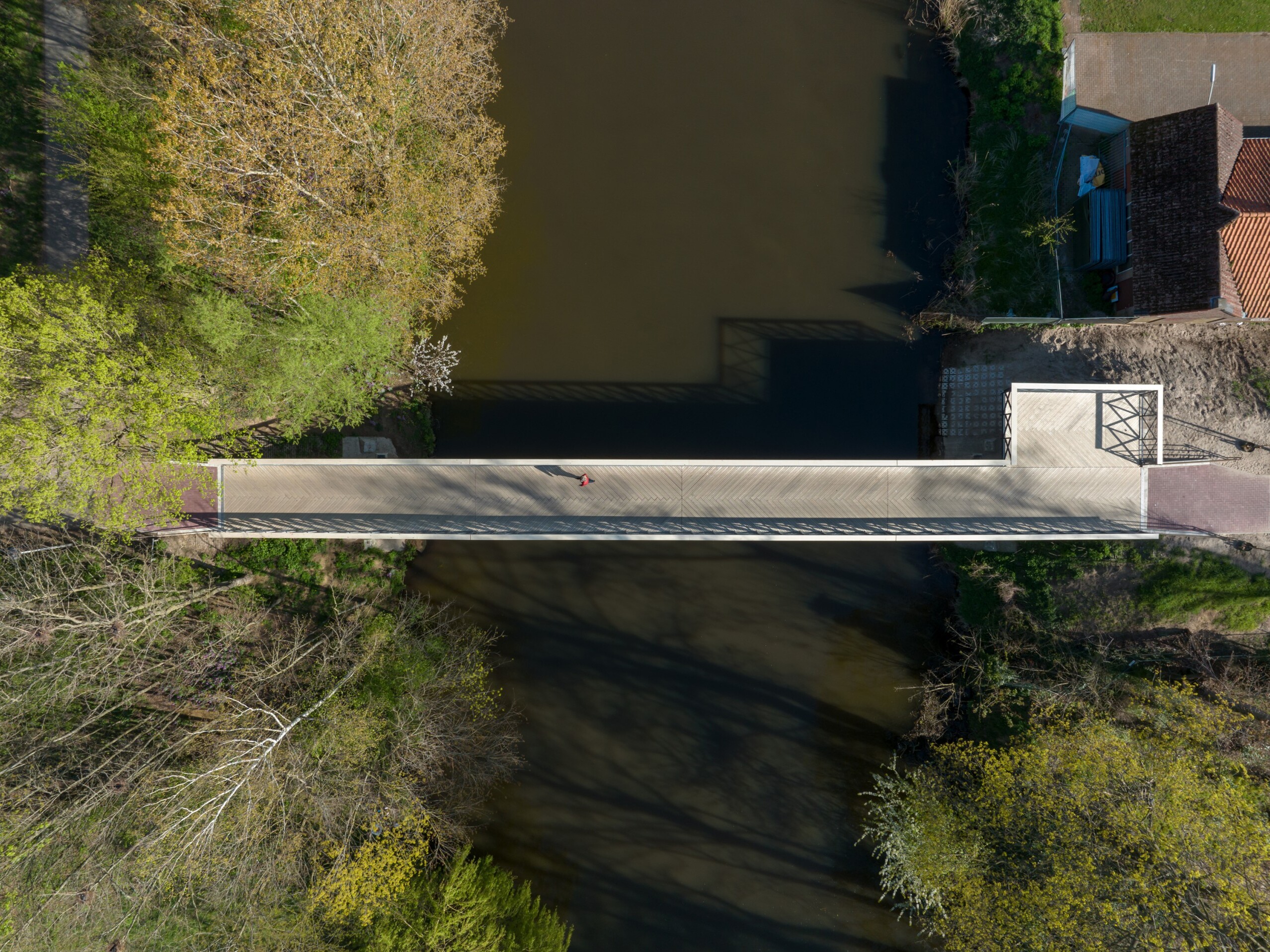 The loadbearing structure of the new bridge includes the steel of the old one. Other materials readily available in the Ulft area were also used, including the iron left over after the demolition of a former factory and the metal from a high-voltage pylon that used to stand next to the bridge and had been demolished the year before. The latter was used to build the bridge’s railings, among other things.