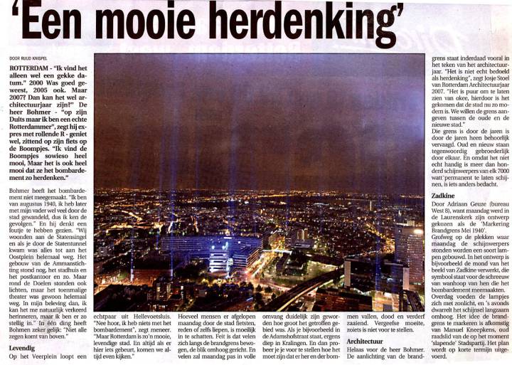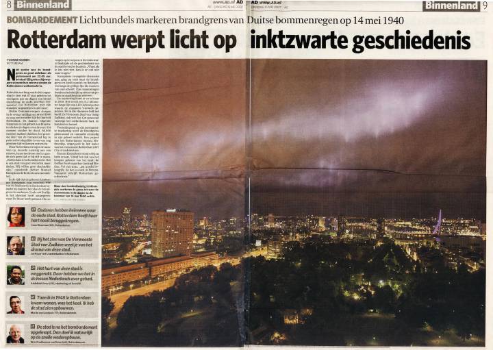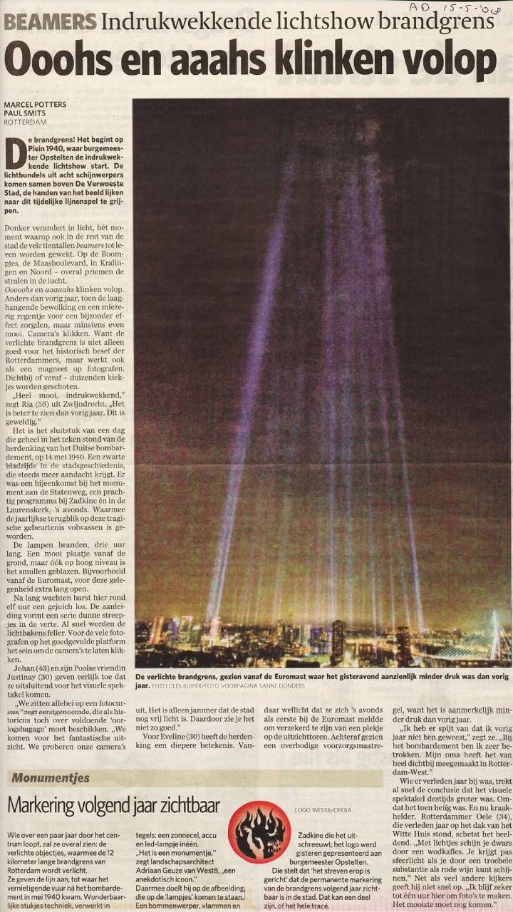 De nacht van 14 mei 2007 staat bij veel Rotterdammers scherp op het netvlies. Zodra de lampen aangingen werd op het laaghangende wolkendek de Brandgrens op een prachtige dramatische wijze zichtbaar. Veel mensen, en niet alleen zij die het bombardement hebben meegemaakt, waren ontroerd. Het zichtbaar en voelbaar maken van de historische gebeurtenis die Rotterdammers in het hart raakt was geslaagd: het verwoeste en het nieuwe hart van Rotterdam kwamen samen. Het kunstwerk bleek bovendien buitengewoon fotogeniek.