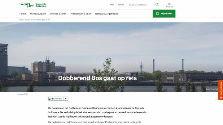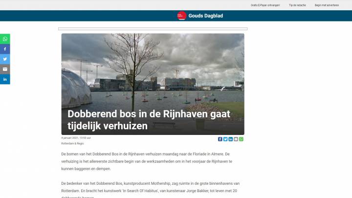 Het project, dat van lange adem en lef getuigd, is een visitekaartje voor de stad Rotterdam als het gaat over bewustzijn van de toekomst. De aanwezigheid van het Dobberend Bos midden in de stad vraagt aandacht voor actuele problemen zoals klimaatverandering en de leefkwaliteit in steden. Het ‘Dobberend Bos’ is dan ook niet alleen een nieuwe belevenis voor de stadsbewoners, jong en oud, maar ook een nieuwe bezienswaardigheid voor de toeristen die Rotterdam op steeds grotere schaal weten te vinden. Het beleven van kunst en het genieten van groen gaan op een heel bijzondere manier hand in hand.