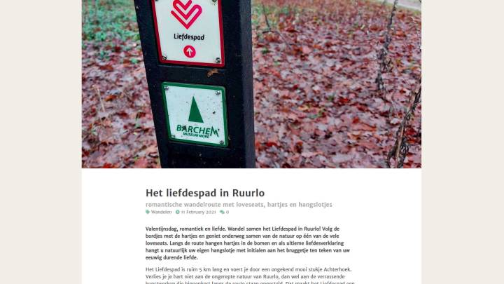 Deze vijf kilometer lange rondwandeling is, zoals de naam reeds zegt, gewijd aan de liefde. Het pad leidt je langs prachtige uitzichten, langs beekjes, bloemenvelden, een graanveld (voor het bier dat de Heikamp zelf brouwt), langs Museum MORE, door statige beukenlanen en romantische plekjes. Langs de route valt er van alles te zien en te doen en dus te beleven. Het pad is een schakel tussen locaties met heel uiteenlopende functies en kwaliteiten.