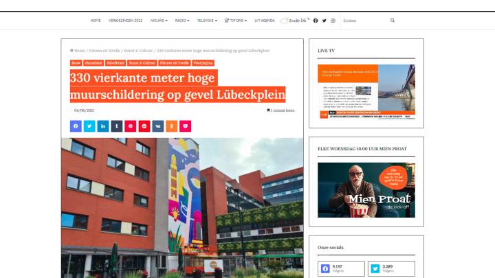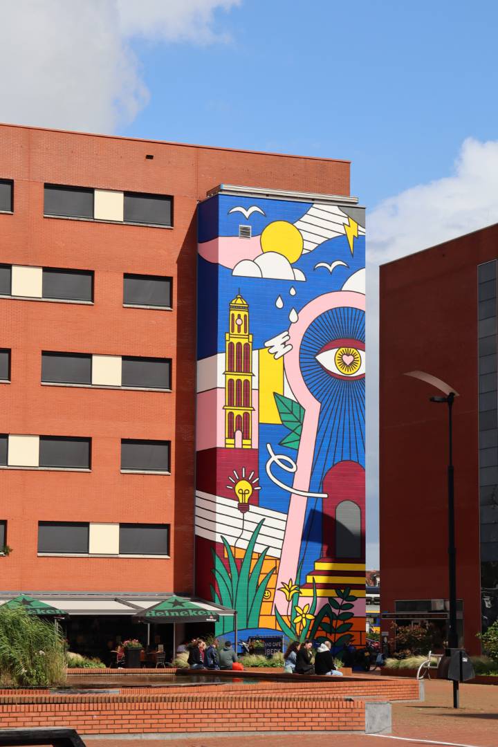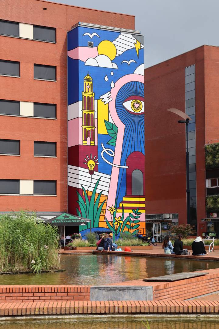 Zoals op het Lubeckplein, waar een gigamuurschildering van 325 vierkante meter kleur, 21 meter hoog en 16 meter breed, een muur bedekt die bekleed is met 9800 tegeltjes. Het plein stond te boek als kaal, leeg en ongezellig. Door de recente herinrichting is het al een meer een echte verblijfplaats geworden, groener, met water en zitplekken. Maar nu! Een alziend oog waakt met liefde over het plein, de stadspoort biedt je ook toegang tot déze wijk, de gestileerde Zwolse kerktoren komt een kijkje nemen in het nieuwe deel van de stad. Een iconische verrijking van de omgeving, die een vrolijke sfeer met zich meebrengt.